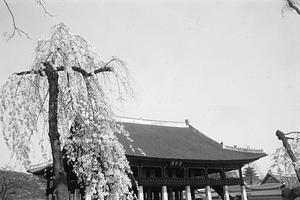 Cherry blossoms blooming over a structure in Gyeongbukgung Palace in South Korea.