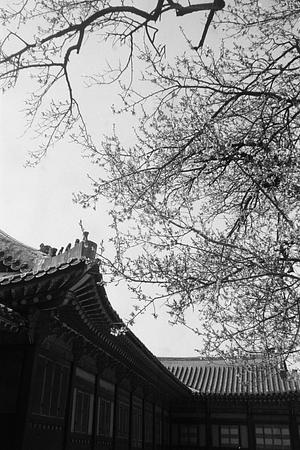 Cherry blossoms blooming over an inner building in Gyeongbukgung Palace in Seoul, South Korea.