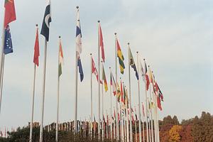The Olympic Park country flags waving over an autumn landscape in Seoul, South Korea.