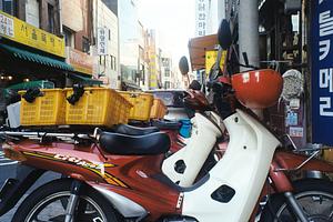 A line of delivery driver's bikes waiting to zoom off in the Chungmuro neighborhood of Seoul, South Korea.